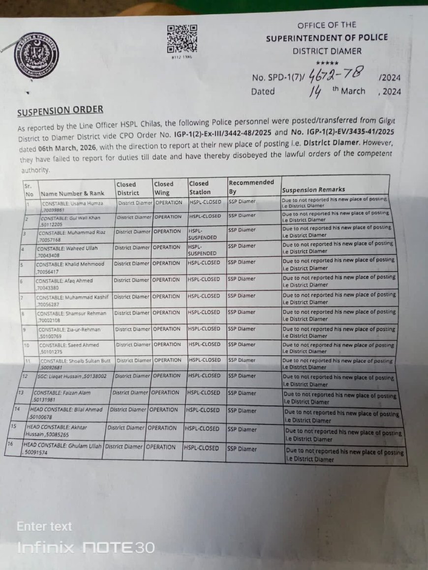 An official suspension order issued by Diamer Police states that the officers, who were transferred from Gilgit, did not comply with posting instructions dated March 6, 2026. The department viewed their continued absence as a direct violation of lawful orders and a serious breach of police regulations and chain of command.