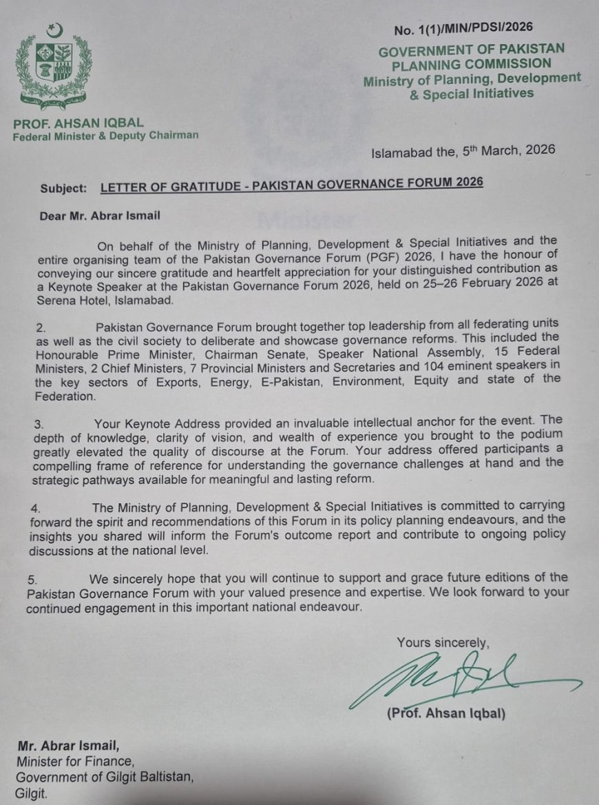 Federal Minister for Planning, Development and Special Initiatives Professor Ahsan Iqbal has formally lauded Ismail’s contribution to the Pakistan Governance Forum 2026, acknowledging his address as a pivotal moment that sharpened the focus of the national dialogue.