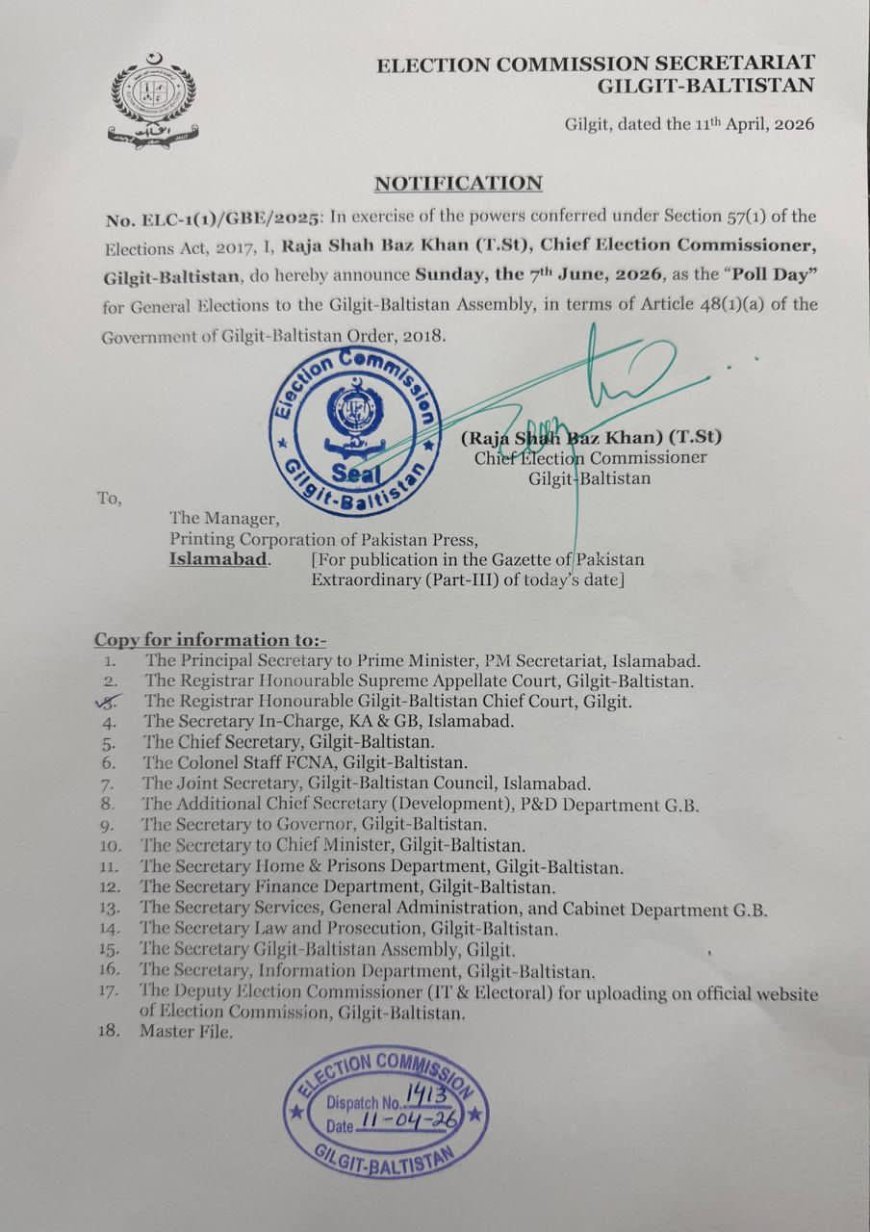 Gilgit -- Voters in Gilgit-Baltistan will go to the polls on 7 June 2026, the region's chief election commissioner has announced, triggering the final stretch of preparations for a new assembly.